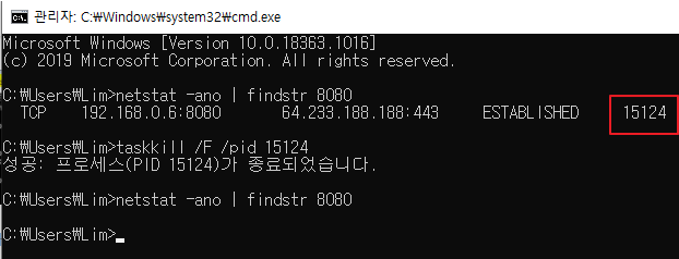 => 포트 8080을 사용하는 프로세스 ID찾기 (위의 경우는 식별자 15124이고, ESTABLISHED한 상태 - taskkill /F /pid pid넘버