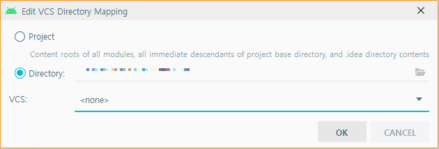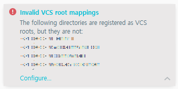 Settings>Version Control 에서 VCS에 빨간글씨로 뜨는 Directory를 <none>으로 선택