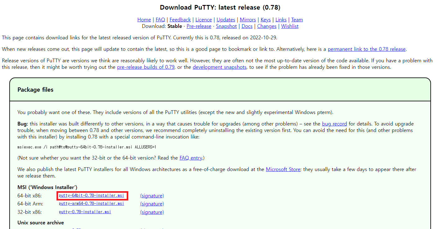 This page contains download links for the latest released version of PuTTY. Currently this is 0.78, released on 2022-10-29. When new releases come out, this page will update to contain the latest, so this is a good page to bookmark or link to. Alternativel
