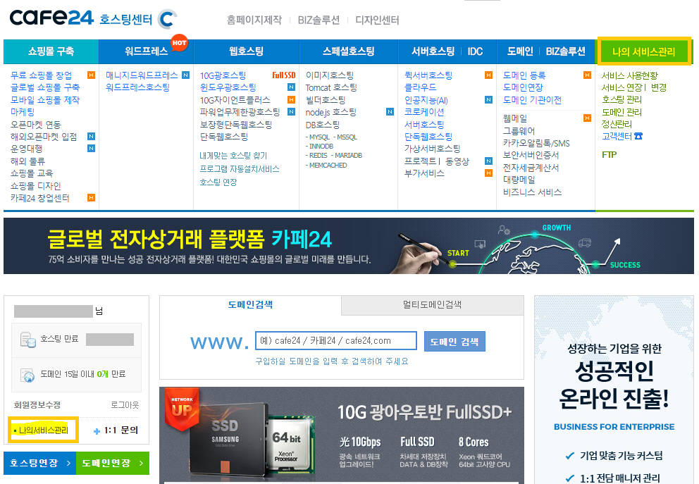 1. 카페24 호스팅센터 접속 > 로그인 > “나의 서비스 관리” 선택
