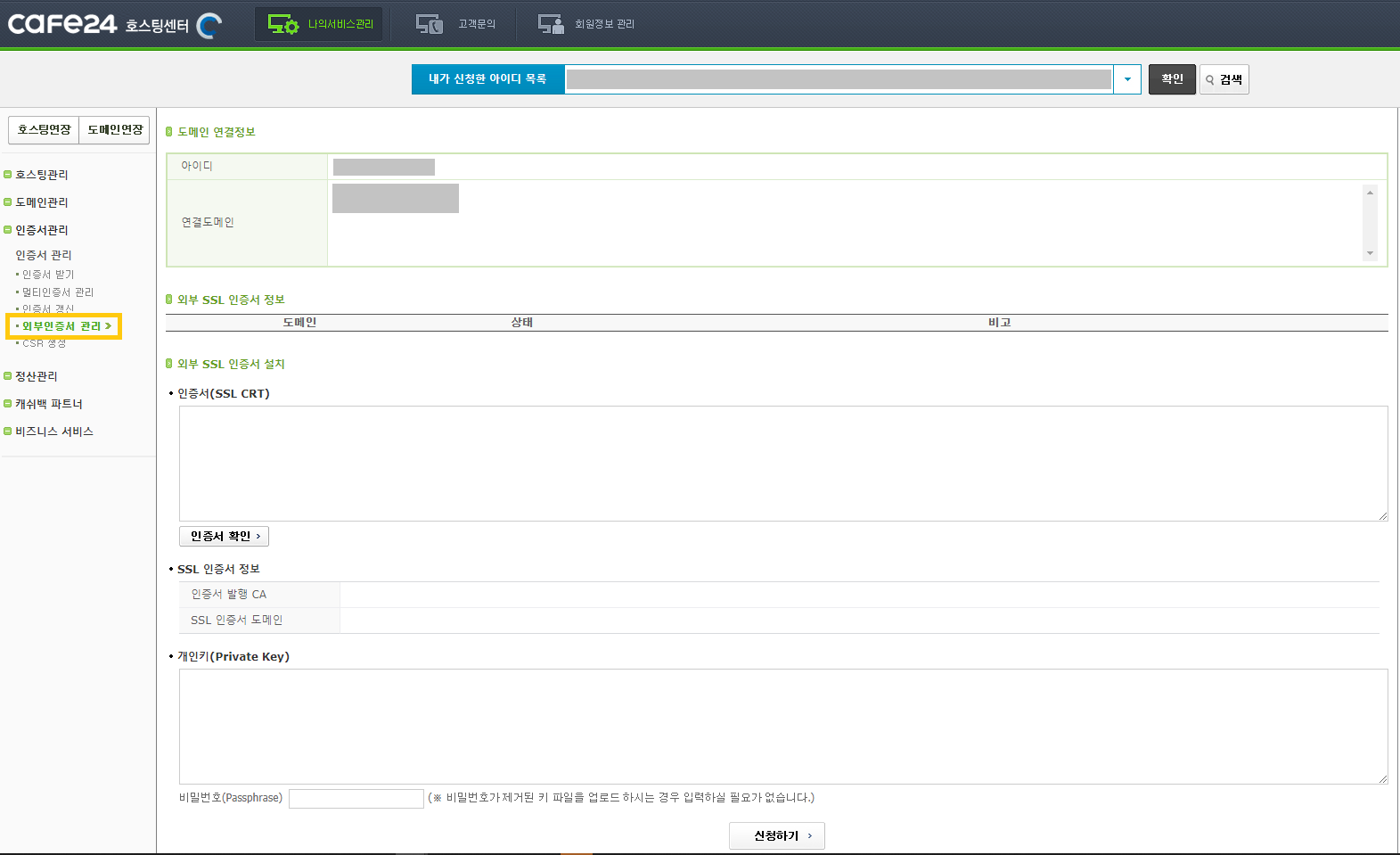 카페24의 경우는 아래와 같이 서비스관리 > 인증서관리 > 외부인증서 관리 메뉴를 따라 이동해줍니다. 참고로 카페24에서 운영하는 아이디가 여러개라면 상단에 “내가 신청한 아이디 목록”에서 보안인증서를 적용할 아이디를 선택해줍니다.