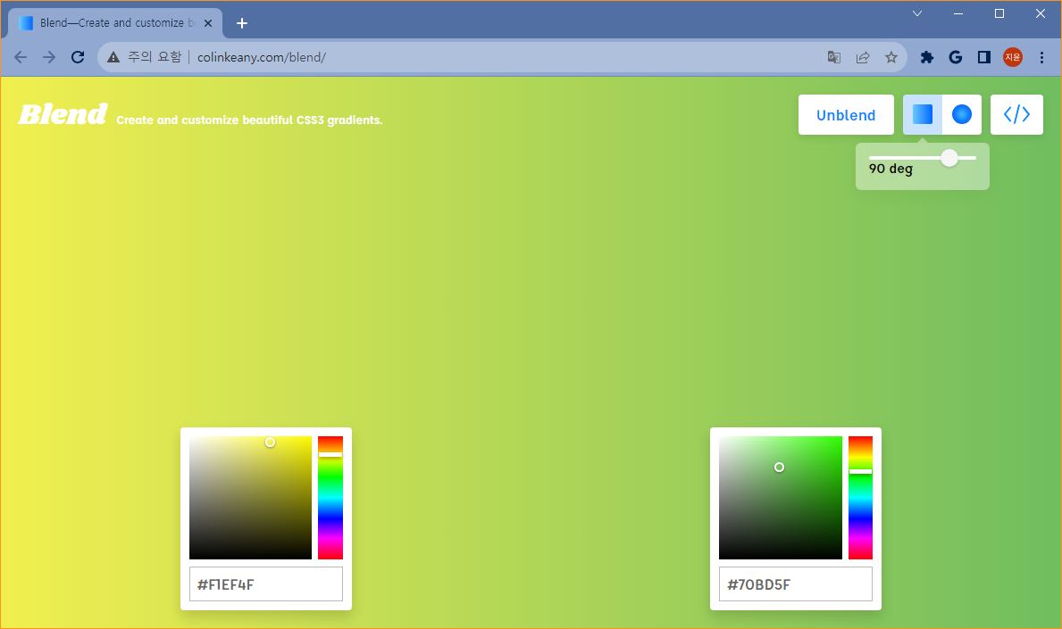 원하는 두 가지의 색상 조합으로 요리조리 각도를 변경해 가며 그라데이션을 만들어볼 수 있는 사이트입니다.