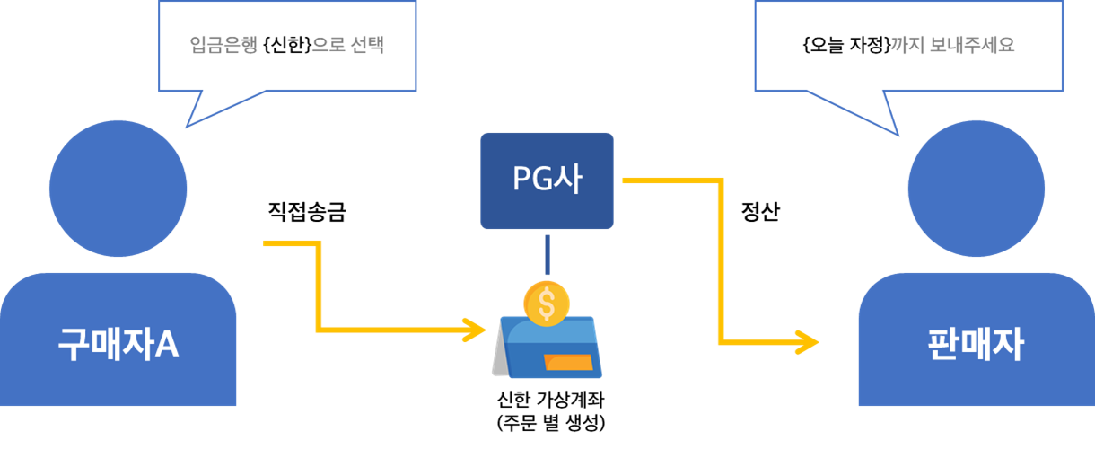 구매자가 원하는 은행을 선택하고 고유하게 생성된 가상계좌를 발급받아 해당계좌로 입금하여 결제를 완료하는 방식