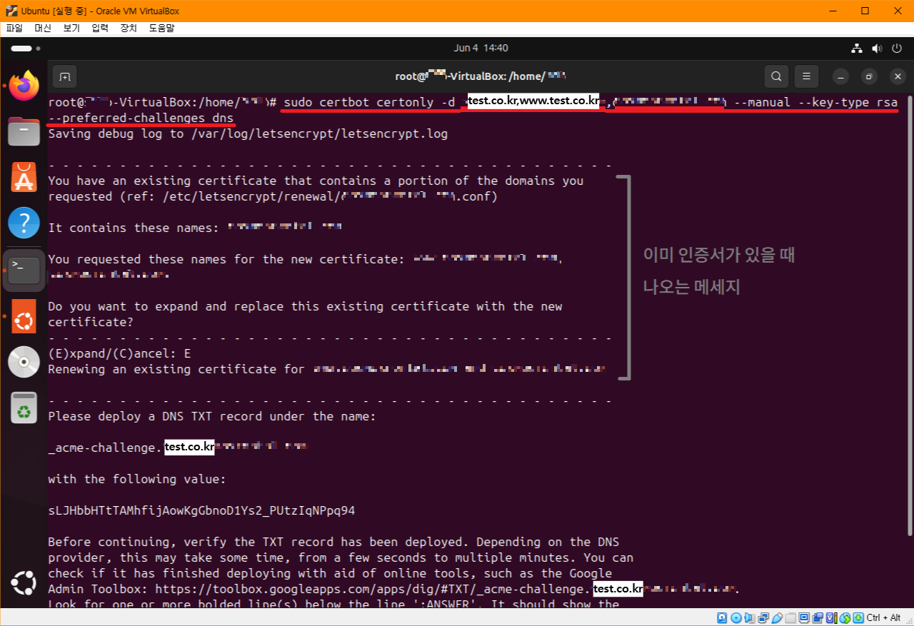 sudo certbot certonly -d 도메인(,로 여러개 등록) --manual --key-type rsa --preferred-challenges dns