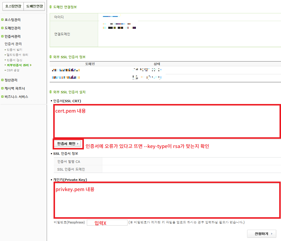 - Cafe24 > 인증서관리 > 외부인증서 관리