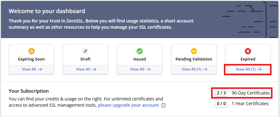 zeroSSL 을 사용하다가 무한로딩에 걸려서 이것저것 알아보던 중, 만료된 인증서가 삭제되지 않고 구독 수에 카운팅되는 걸 알아버렸다..